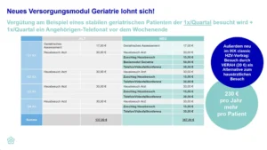 Neben den bereits etablierten Leistungen rund um die geriatrische Versorgung wird mit der Aufnahme eines Geriatrischen Versorgungsmoduls die Versorgung dieser Patientengruppe stark aufgewertet. Attraktive Zuschläge auf die Besuchsleistungen inklusive.