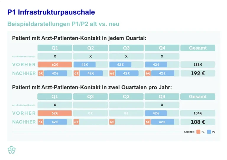 Durch die Umgestaltung der P1 und P2 werden die Zuschläge Z1 (Pharmakotherapie), Z3 (Impf-Zuschlag) und Z4 (Psychosomatik) jetzt einmal pro Quartal anteilig, statt in einer Summe ausgezahlt. Es kommt daher in der Abrechnung für das 3. Quartal 2024 ebenfalls zu Stornierungen für bereits geleistete Vorauszahlungen, die Sie in der vorherigen Abrechnung erhalten haben. Der Gesamtbetrag, den Sie jährlich erhalten, bleibt dabei unverändert.
